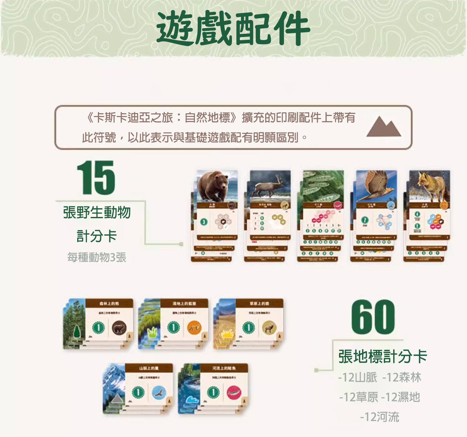 模式,本擴充還有更多全新的野生動物計分卡版和棲息地板塊,為遊戲帶多新的變化,更有充足