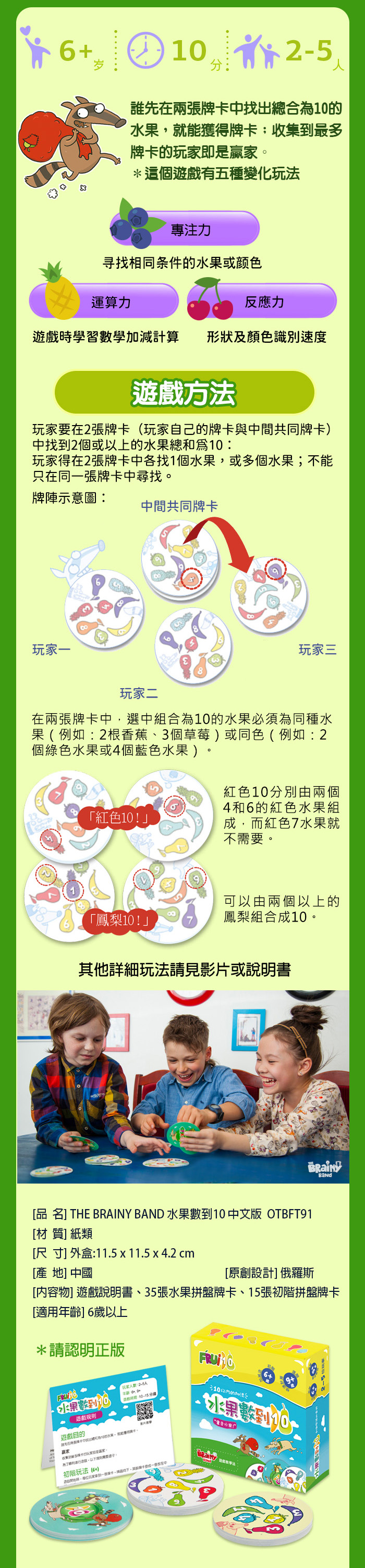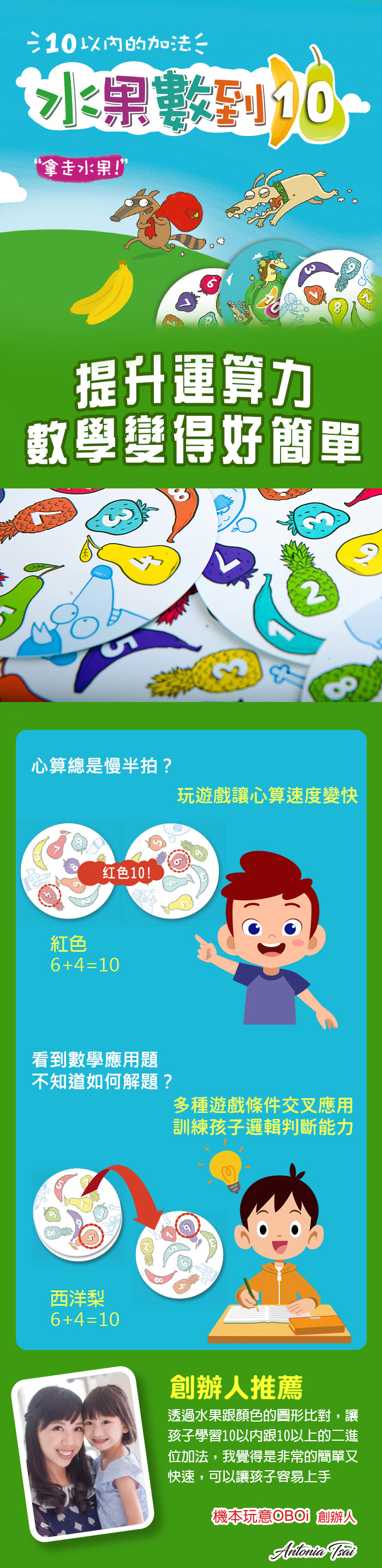 提升兒童運算力和聯想力的STEM桌遊!首先在兩張卡片之間找出總數為10的水果的玩家獲得本回合的卡牌,最後獲得最多卡牌的玩家獲得遊戲勝利!