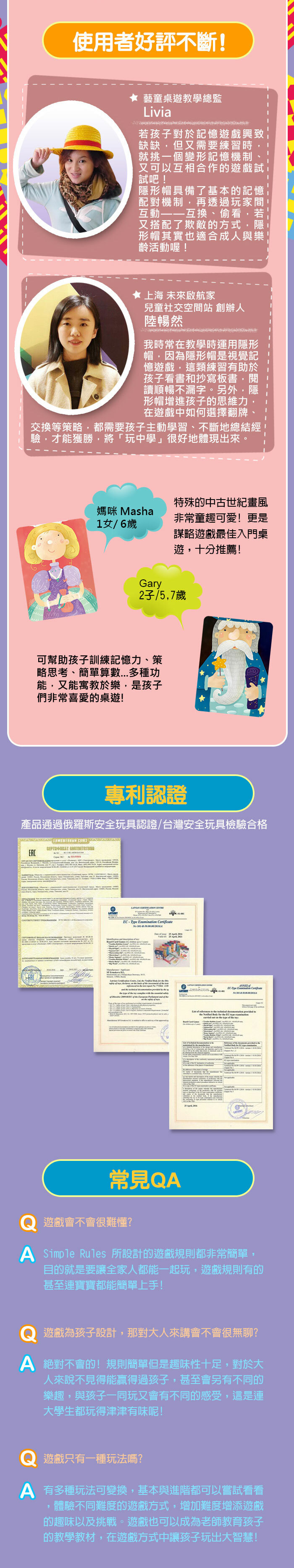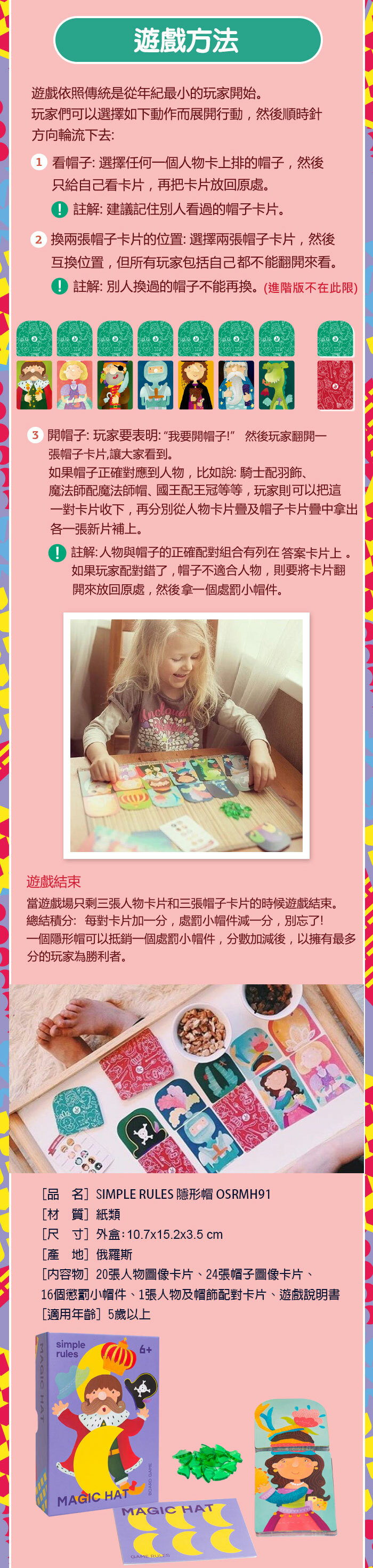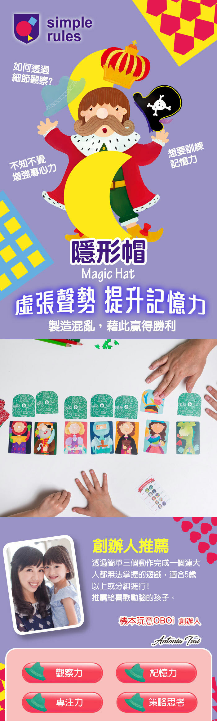 隱形帽是一個用於訓練幼童觀察力和記憶力的STEM 桌遊,玩家需要記得不同角色的帽子組合,有時更需要虛張聲勢,令對手猜錯隱藏的帽子。[遊戲人數] 2-4人