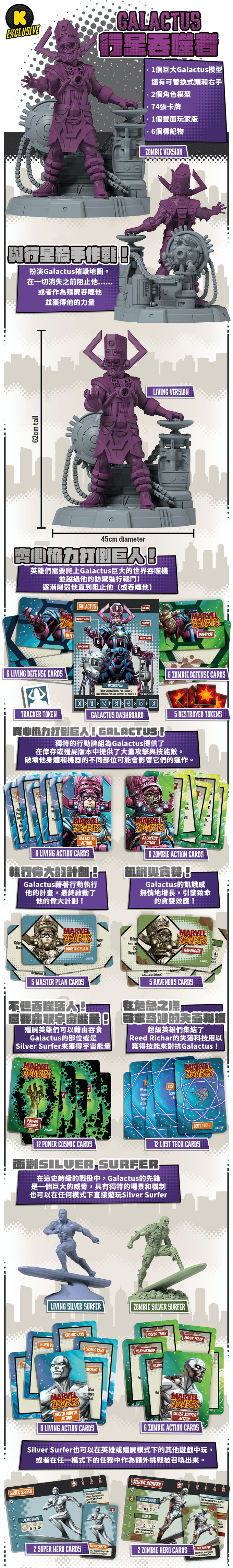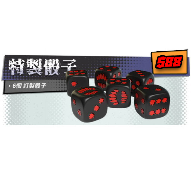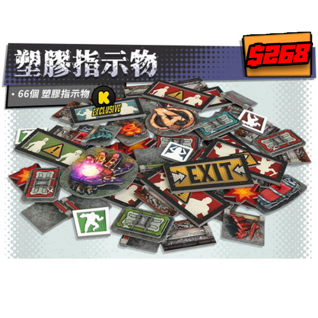 內容物:87隻人物模型、136張卡片、9個雙面圖版、6個塑膠玩家版塊、6個骰子、12個標記方塊、6色底座套、41個板塊