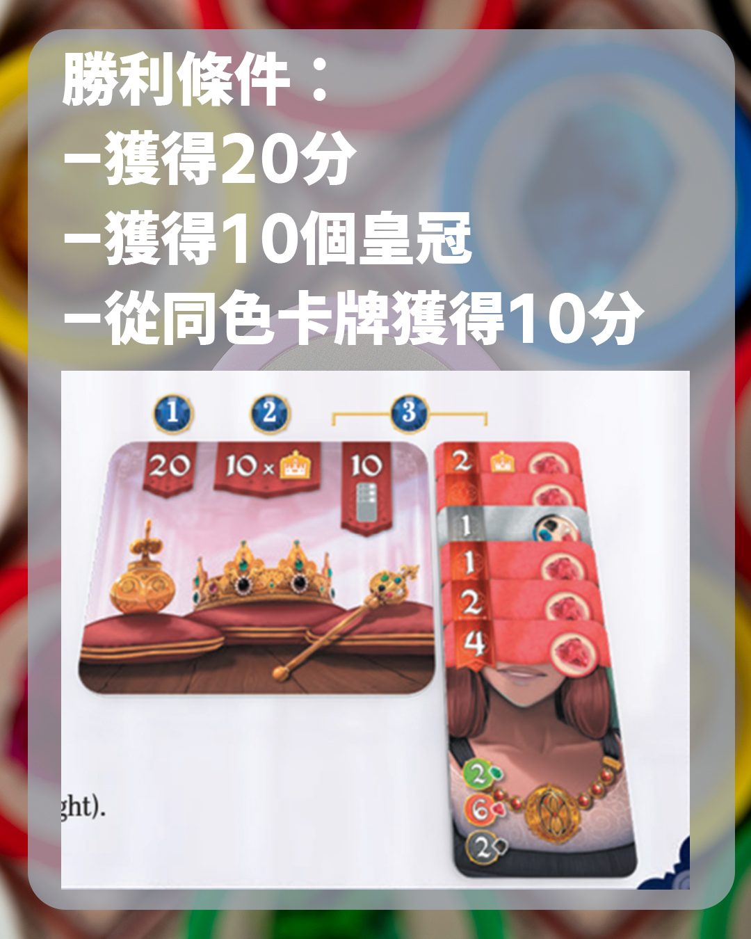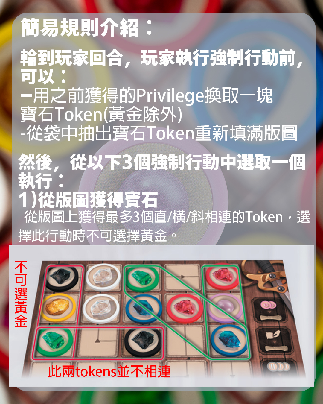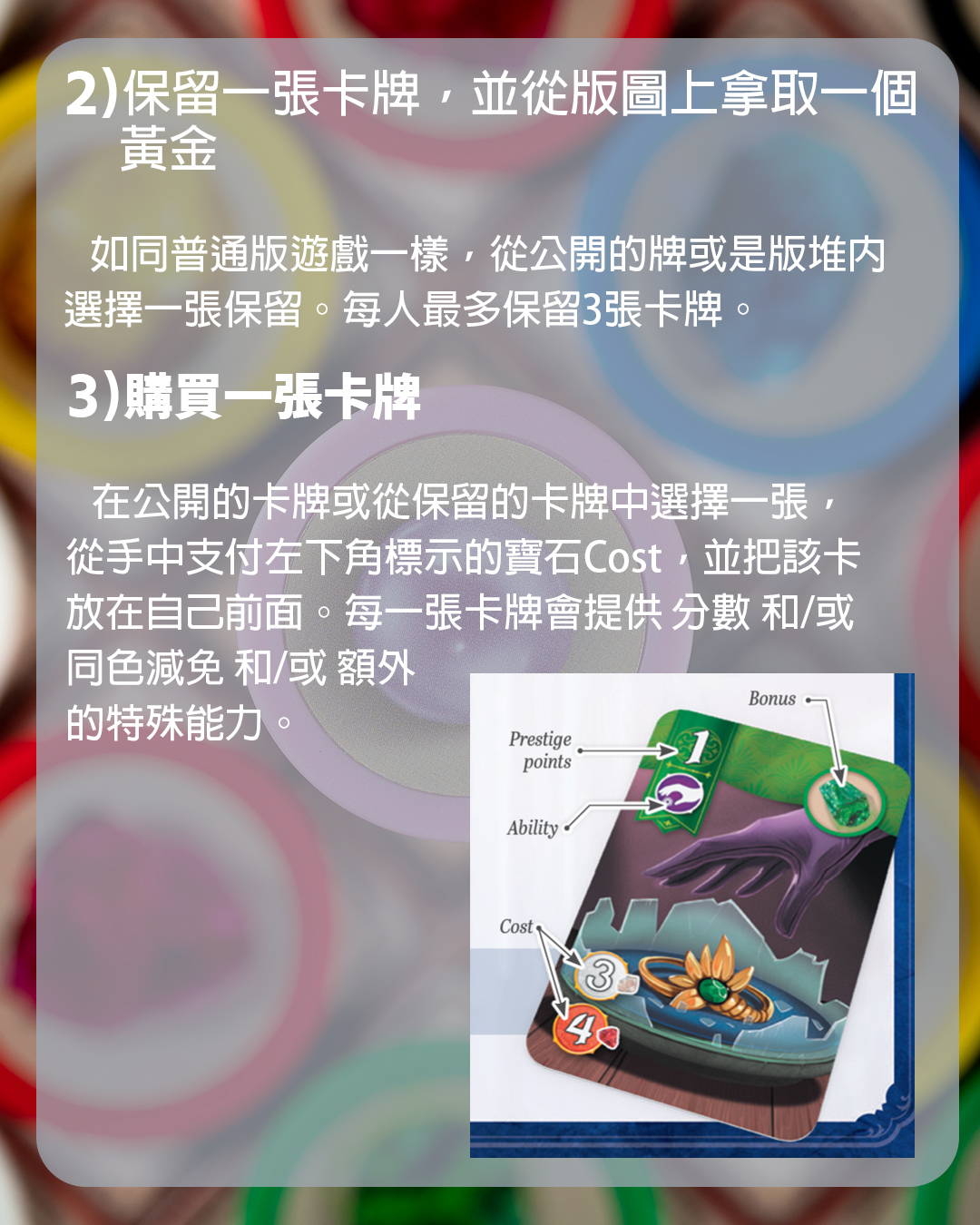 作為璀璨寶石系列最新作品,這次你扮演珠寶公會的首領,為文藝復興時期的君王和侯爵領袖們打造莊嚴的飾品來增加你的名聲與財富。然而,你有個極富野心的對手,該是展現你價值的時刻到了!面對你的對手公會來場勝利的對決。從版圖上拿取寶石與珍珠指示物,並購買寶石卡,蒐集紅利點數,皇家支援與獲得名聲。