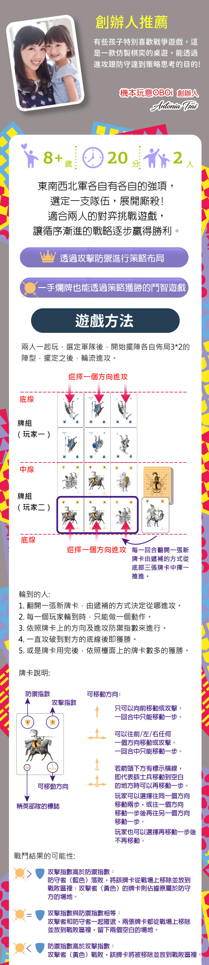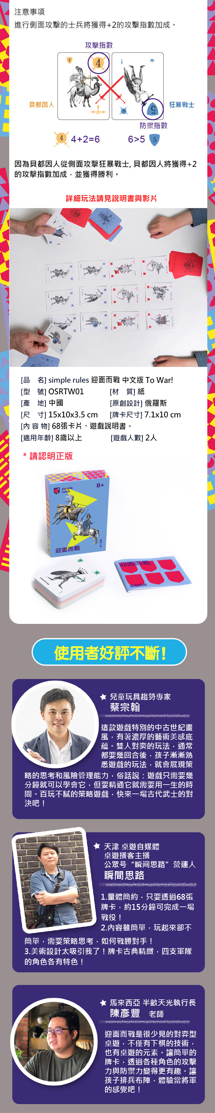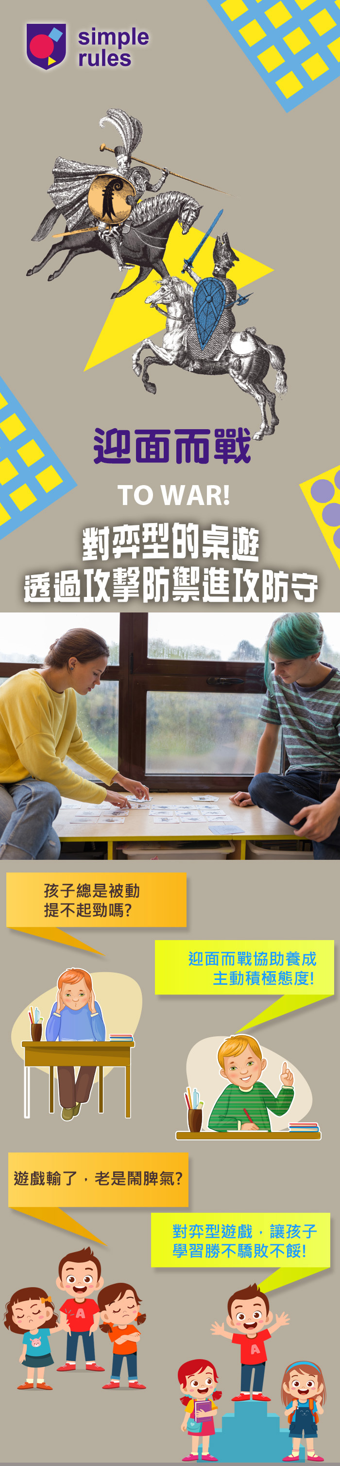 《迎面而戰》 / "To War!" 是一隻適合8歲或以上的雙人對戰遊戲,結合了象棋/西洋棋和桌遊元素,玩家可以控制不同國家的軍隊排兵佈陣,當你的士兵攻入敵人的陣地時贏得遊戲。可以訓練兒童體驗勝敗乃兵家常事,勝不驕敗不餒。 適合小學或以上兒童的入門級策略遊戲。